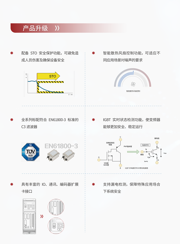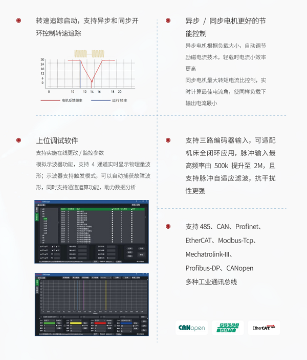 紧凑的书本式设计,可并排安装,节省安装空间,无需降容, 最大减小70%安装面积 支持LED、LCD外引键盘,支持PC上位机 支持三编码器信号同时输入,支持主轴全闭环应用 丰富的扩展功能,实现通讯卡,编码器卡,IO卡自由扩展 编码器类型自动识别,支持实时位置显示 两路编码器信号输入(支持增量式、UVW混合式、旋转变压 器等速度反馈形式)